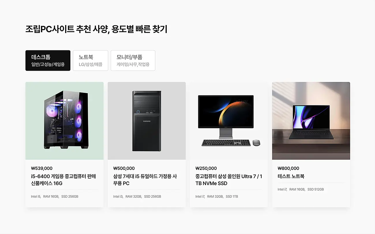 예를 들어, 이번 김포 홈페이지 제작 과정에서 저희가 활용한 방식은 고객들이 어떤 컴퓨터를 구매해야 할지 쉽게 결정할 수 있도록 제품 가격에서 사양, 용도 등을 필터링 할 수 있도록 구성했죠.